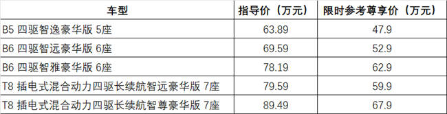 全新XC90共推出5款車型,售價分別為:B5四驅智逸豪華版5座售價63.89萬元,B6四驅智遠豪華版6座售價69.59萬元,B6四驅智雅豪華版6座售價78.19萬元,T8插電式混合動力四驅長續航智遠豪華版7座售價79.59萬元,T8插電式混合動力四驅長續航智尊豪華版7座售價89.49萬元。2025年4月15日-30日購車,可享受限時參考尊享價47.9萬元-67.9萬元。