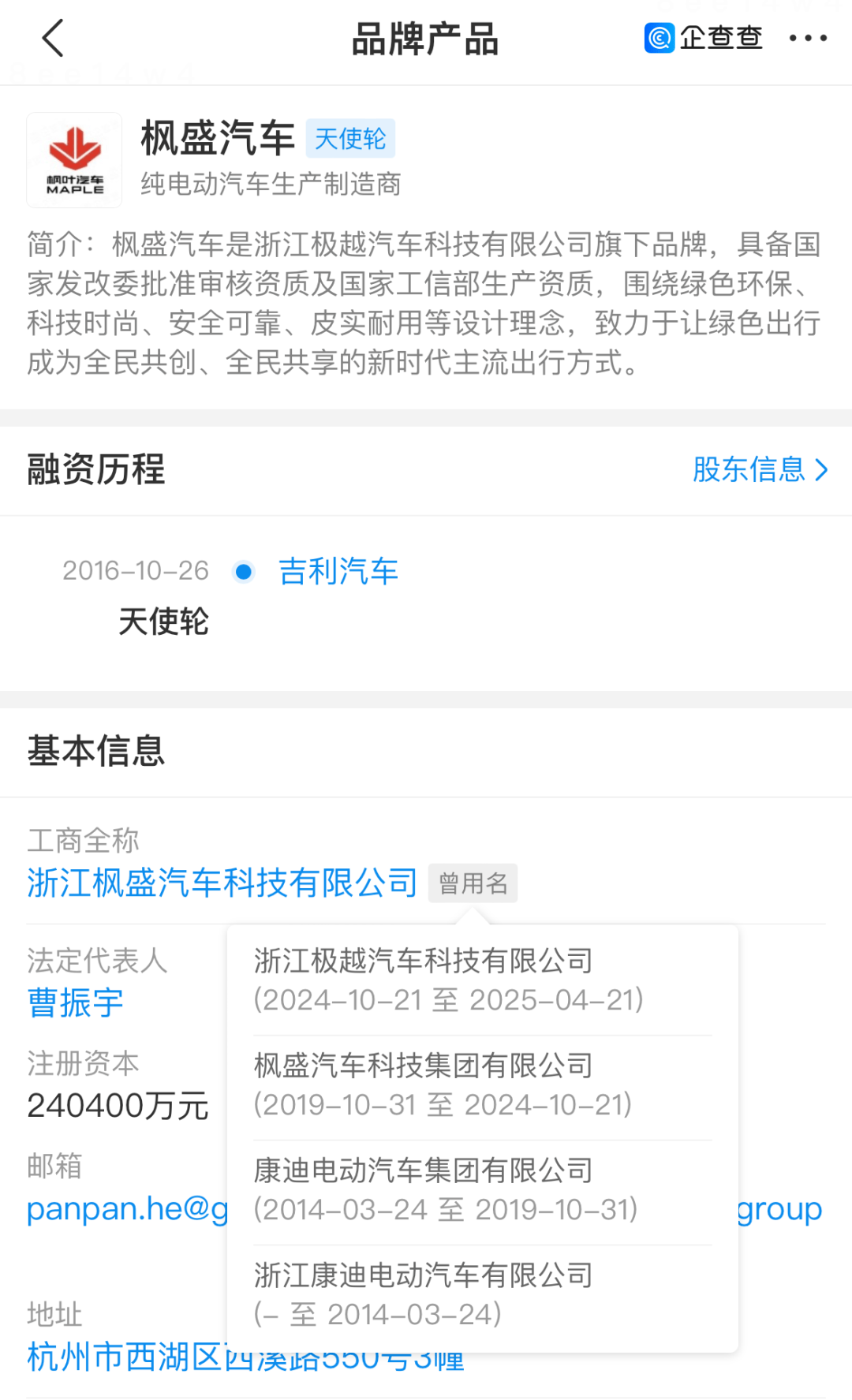 企查查的公開信息顯示,浙江極越汽車科技有限公司目前已變更名稱為浙江楓盛汽車科技有限公司——2024年10月,其才從“楓盛”更名為“極越”,這家公司具備國家發改委批準審核資質及國家工信部生產資質。在更名的同時,該公司新增股東臺州吉利汽車工業有限公司,持股比例為0.01%,此次更名背后的意義耐人尋味,同時也讓極越汽車再次引發關注。