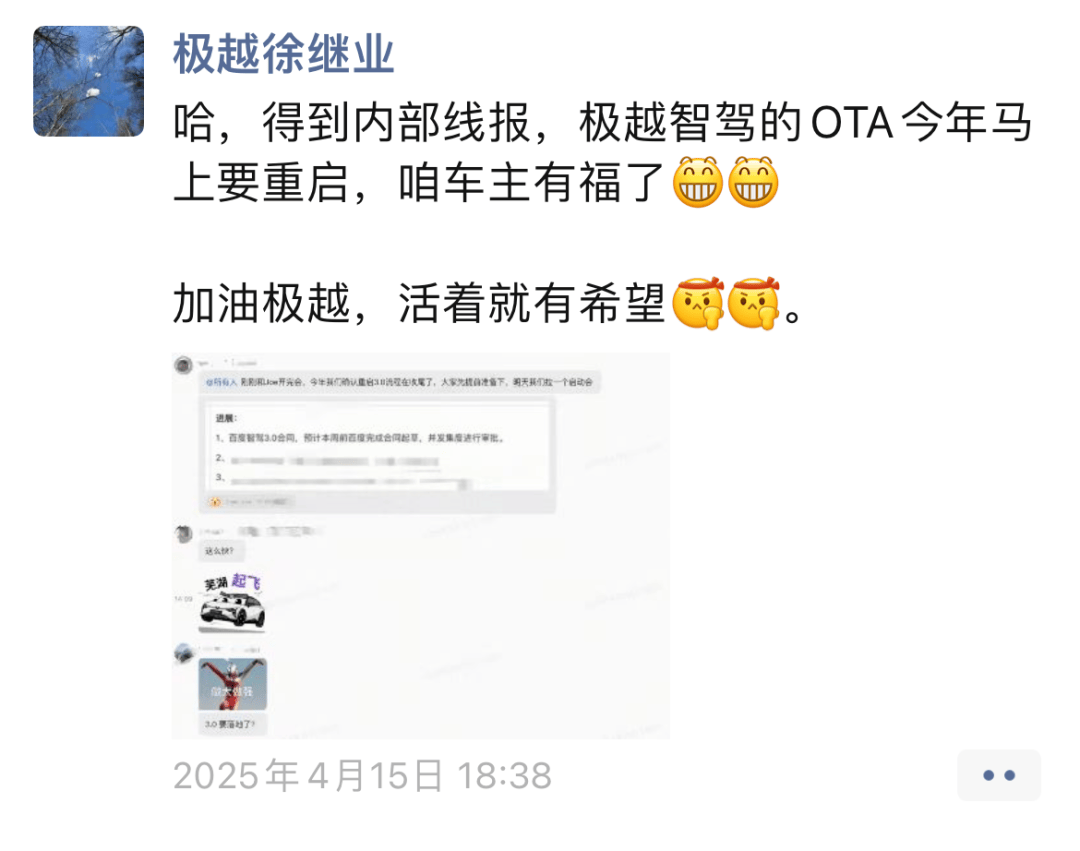 在紀錄片播出的前一天,極越公關負責人徐繼業在朋友圈表示,極越智駕的OTA今年要重啟。從他發出的圖片來看,應該是極越的內部溝通群信息,上面的進展顯示,預計百度將完成智駕3.0的合同起草,并發集度進行審批。