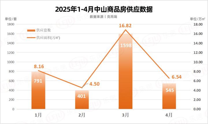 商品房供應方面也有明顯下降,克而瑞數據顯示,4月中山商品房供應共545套,環比下降約66%;總供應面積約6.54萬㎡,環比下降約61%。