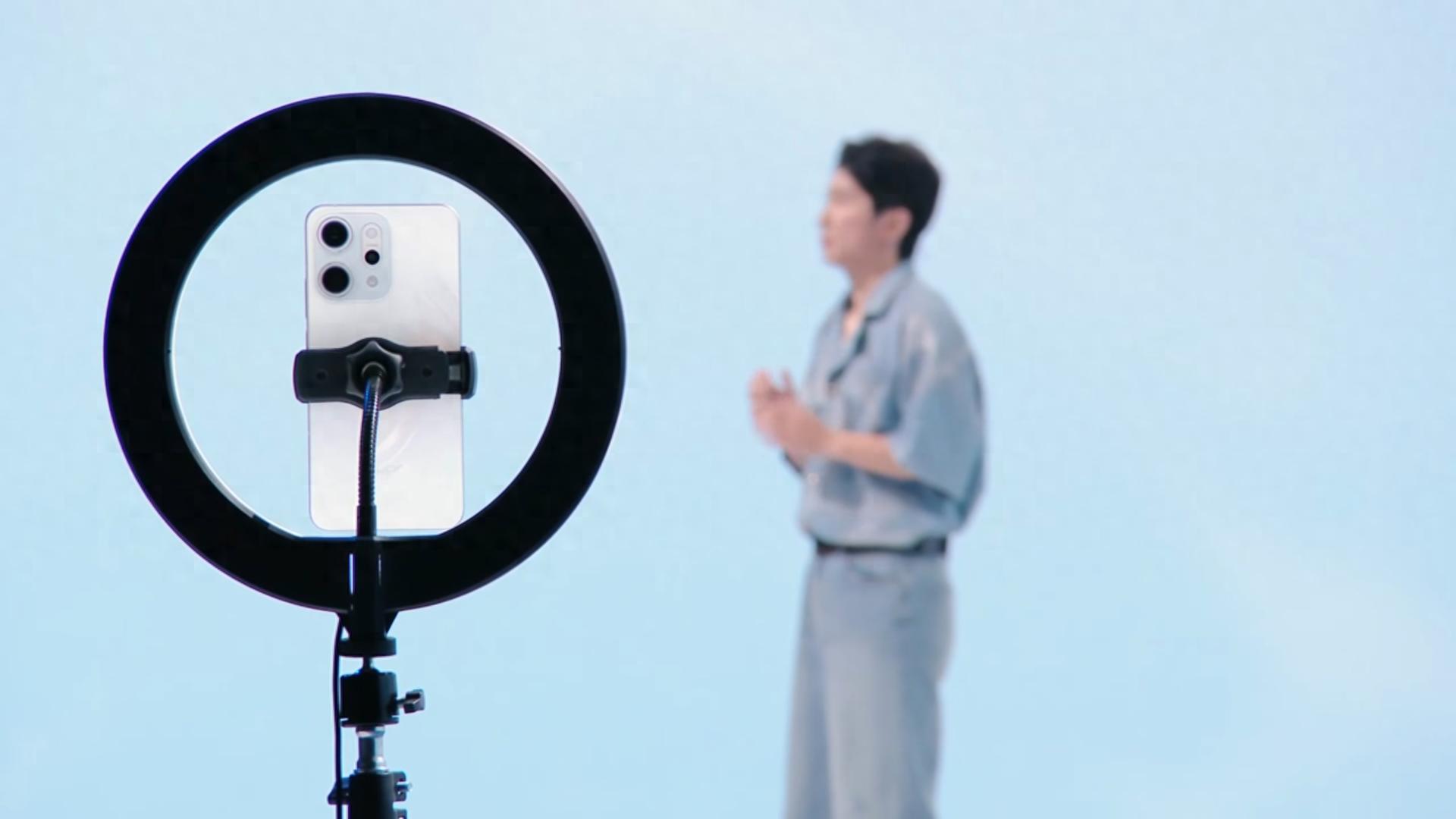 現在有請我的同事帶上一個特別的道具。”OPPO Reno系列產品經理陳思聰話音剛落,鏡頭便給到了舞臺一側擺好的一副搭配了直播圓環燈的手機支架,上面還綁著一臺正在發布的Reno14 Pro新機。