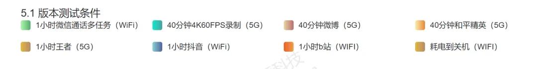 注:測試環境主要包括1小時微信通話多任務(WiFi)、40分鐘4K 60FPS視頻錄制、40分鐘微博、40分鐘和平精英、1小時王者、1小時抖音、1小時嗶哩嗶哩,最好耗電到關機。