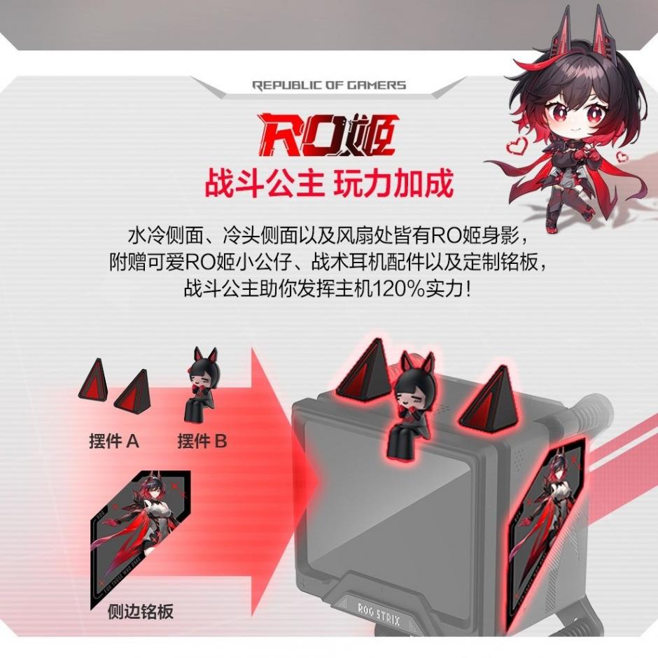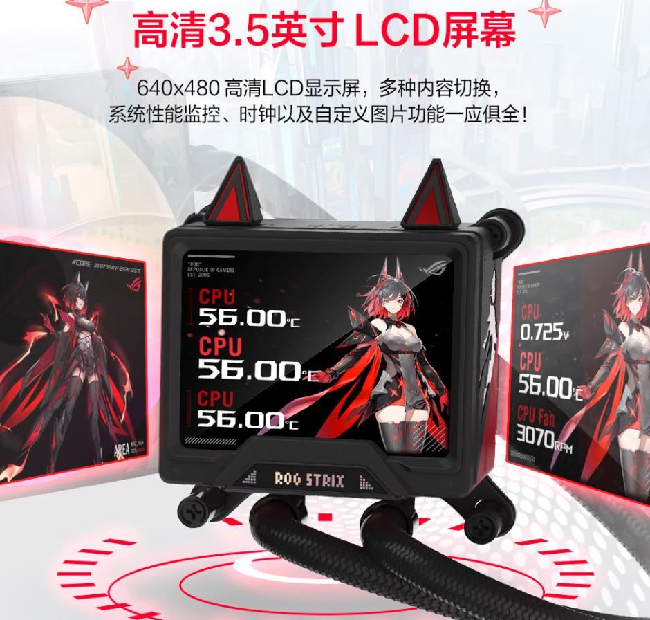 而在顏值方面,這款一體水冷頭搭載 3.5 英寸 640×480 方形 IPS LCD 顯示屏,還擁有配套 RO姬 定制側面銘板以及放置在冷頭上的 ROG 小公仔、戰術耳機擺件。