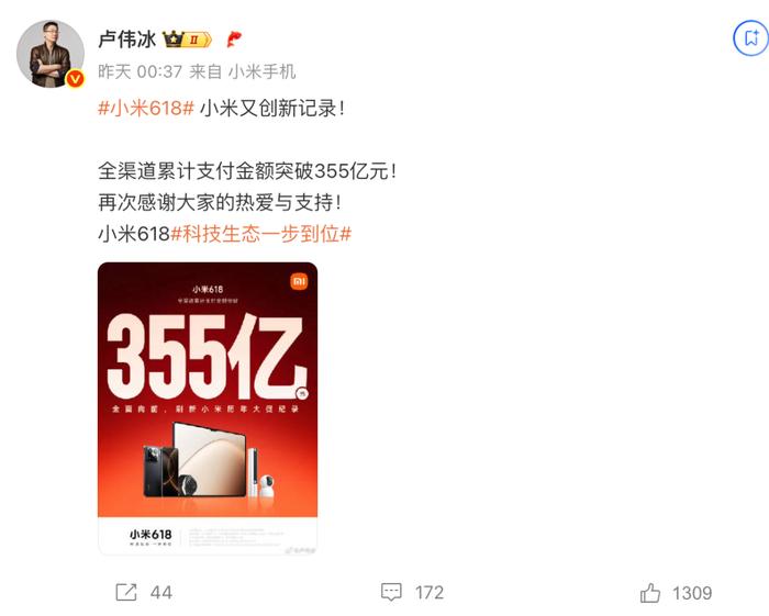 近日,小米集團(tuán)合伙人、總裁,國際部總裁,Redmi 品牌總經(jīng)理盧偉冰發(fā)布了小米 618 銷售戰(zhàn)報,數(shù)據(jù)顯示全渠道累計支付金額突破 355 億元,成功刷新了歷年大促的紀(jì)錄。