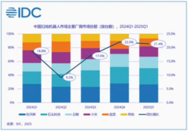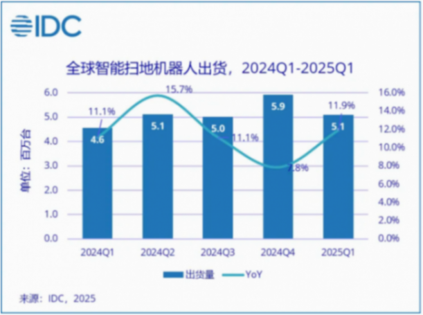 IDC數(shù)據(jù)顯示:2025年第一季度(1-3月)全球智能掃地機(jī)器人市場出貨量達(dá)509.6萬臺,同比增長11.9%;頭部廠商市場份額集中度加劇,Top5廠商出貨已占到整體市場的63.4%,較去年同期提升3.5%。中國頭部廠商持續(xù)擴(kuò)張。