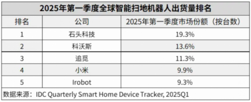 具體2025Q1全球市場來說,智能掃地機(jī)器人出貨量排名TOP5依次是:①(208.540, 0.04, 0.02%)(約19.3%份額)②(53.880, -0.23, -0.43%)(約13.6%份額)③追覓(約11.3%)④小米約(9.9%)⑤IroBot(約9.3%)。