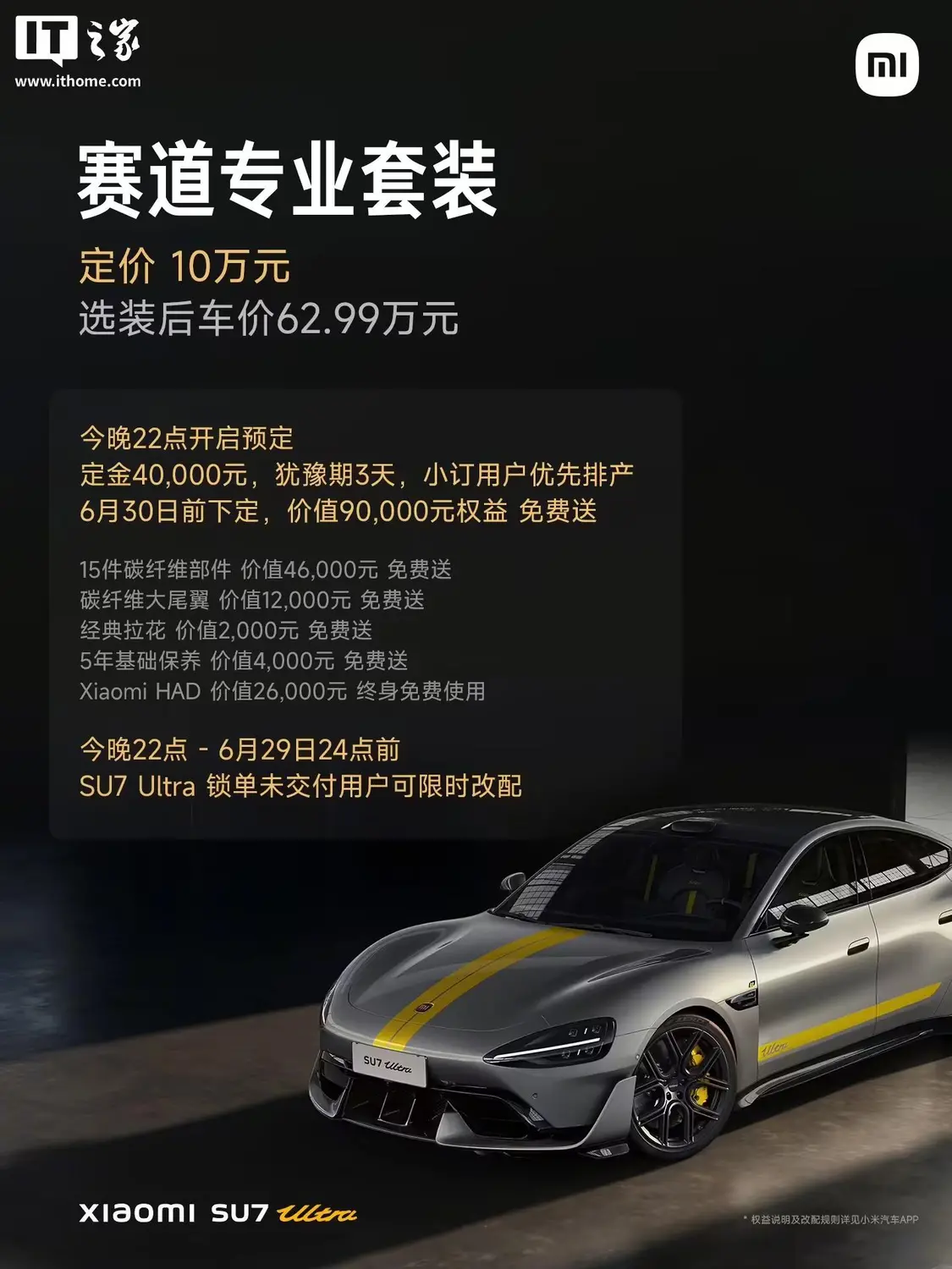 官方還發布了定價 10 萬元的賽道專業套裝,選裝后車價為 62.99 萬元(標準版 SU7 Ultra+10 萬元)。