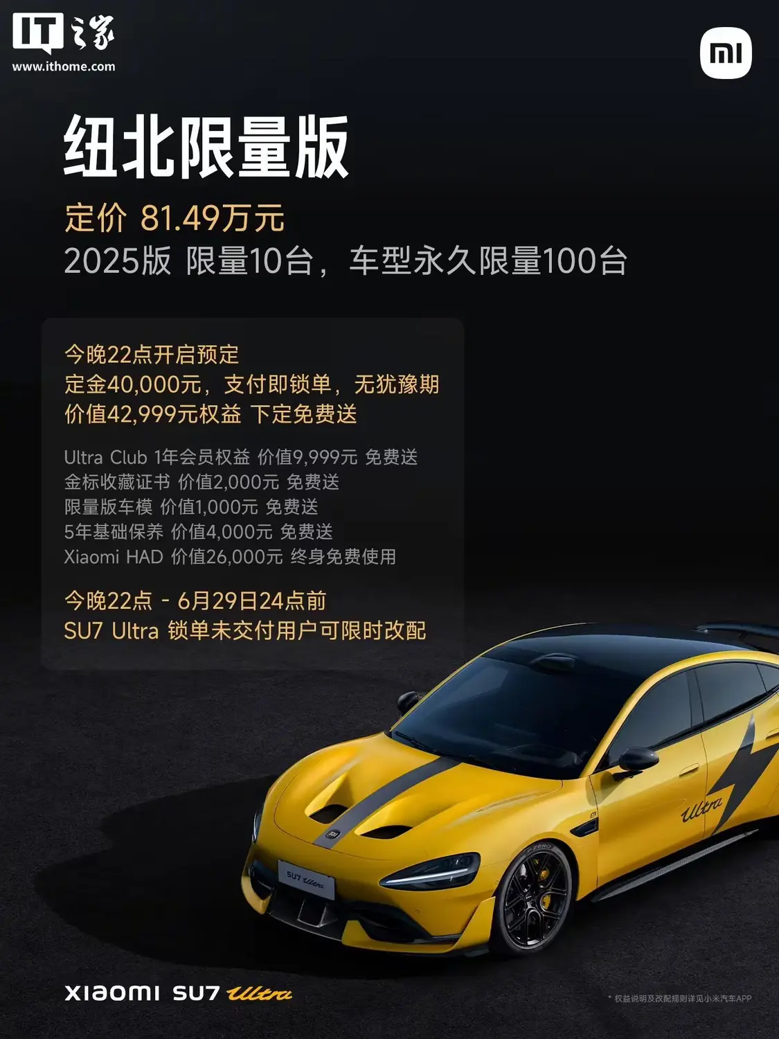 IT之家注意到,小米 SU7 Ultra 紐北限量版在 6 月 26 日的小米人車家全生態發布會上正式亮相,車型永久限量 100 臺,2025 版限量 10 臺,定價 81.49 萬元。