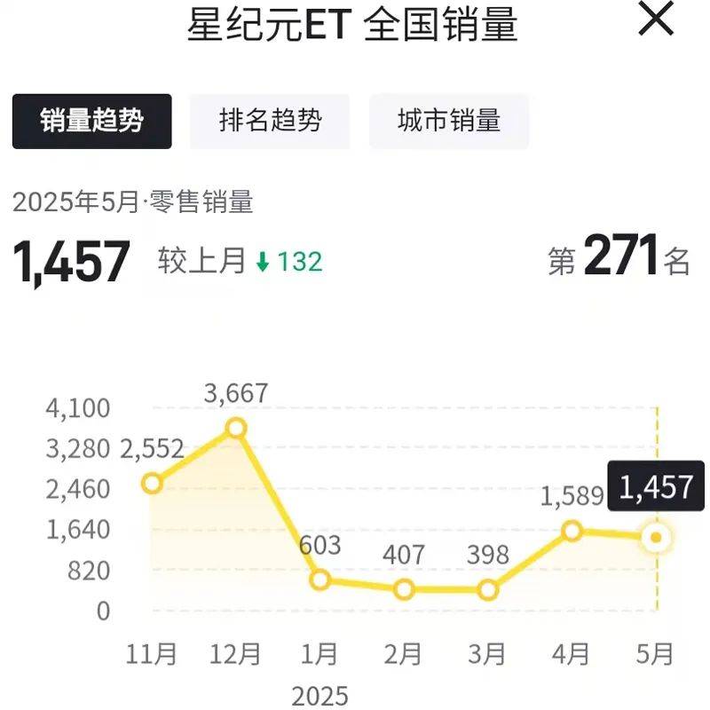 而星紀元ET在今年5月份的銷量為1457輛,相比今年4月份的銷量1589輛,環比下滑8.3%。