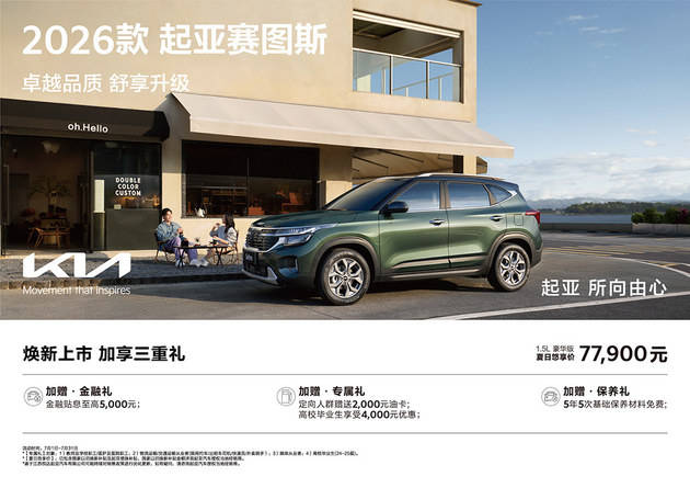 7月2日,2026款起亞賽圖斯魅力上市,新增1.5L豪華舒享版車型,共推出8種配置車型。7月1日-7月31日期間,消費者購買1.5L豪華版車型可享“夏日悠享價”7.79萬元。同時,購車用戶還可享金融貼息至高5000元、定向人群贈送2000元油卡及高校畢業生優惠4000元、5年5次基礎保養材料免費等多項超值權益。