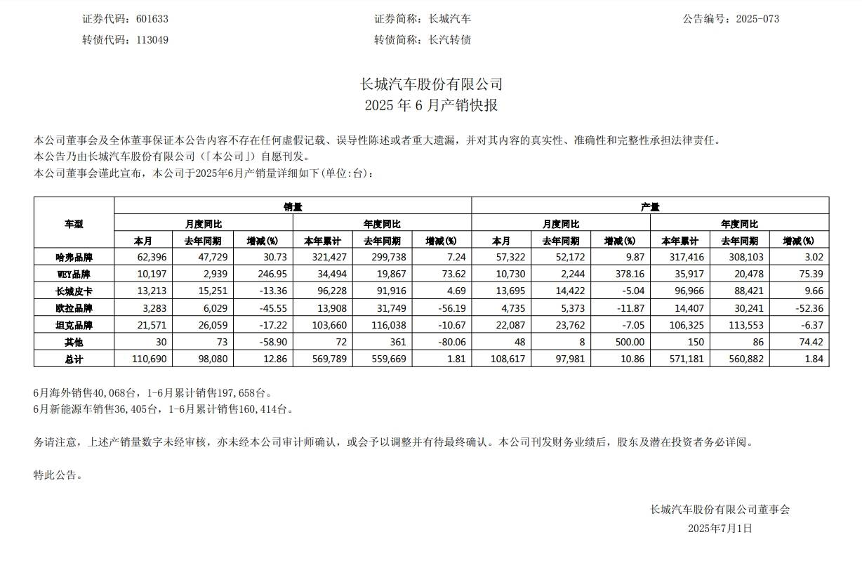 上半年,長城汽車累計銷量約57萬輛,同比增長1.81%。這樣的增速算不得高,不過,考慮在上半年國內市場波瀾起伏的大環境下,長城汽車還能有增長,表明它經受住了市場的考驗。