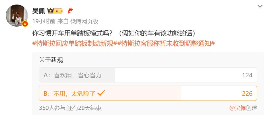 昨天我在微博上發起了關于使用單踏板模式的投票,目前有差不多65%的網友表示單踏板模式太危險了,就算自己車輛有也不想用。