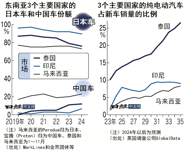 但電動化浪潮正在改寫格局。以泰國為例,2023年中國品牌市場份額已升至11%,同比翻番,日系車份額則跌破80%。其中,比亞迪表現亮眼,2024年市占率達4.3%,位列第五;在泰國純電市場更是長期霸榜首位。
