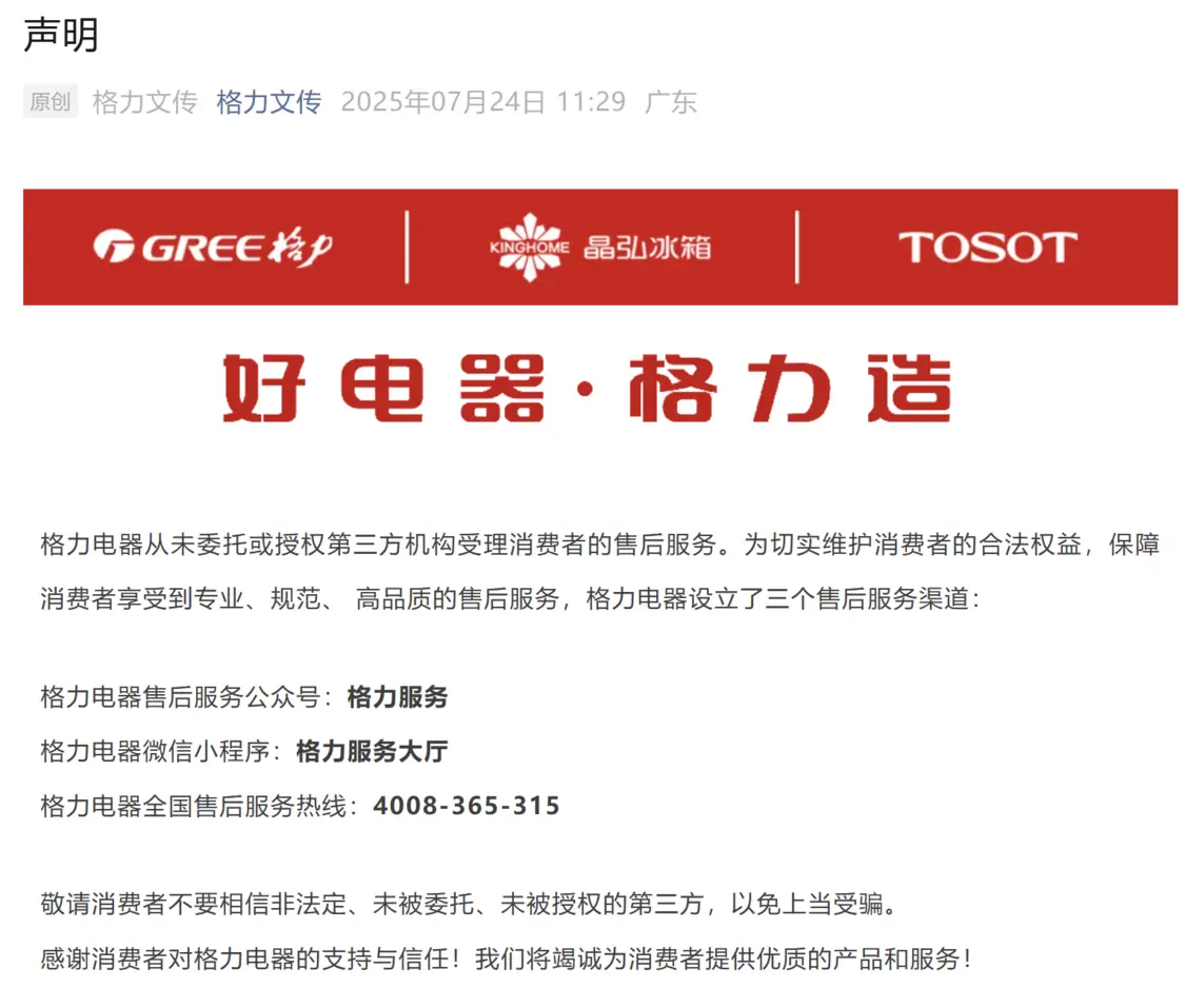 7月24日,格力電器在其微信公眾號發(fā)布聲明,明確表示格力電器從未委托或授權(quán)第三方機(jī)構(gòu)受理消費(fèi)者的售后服務(wù)。