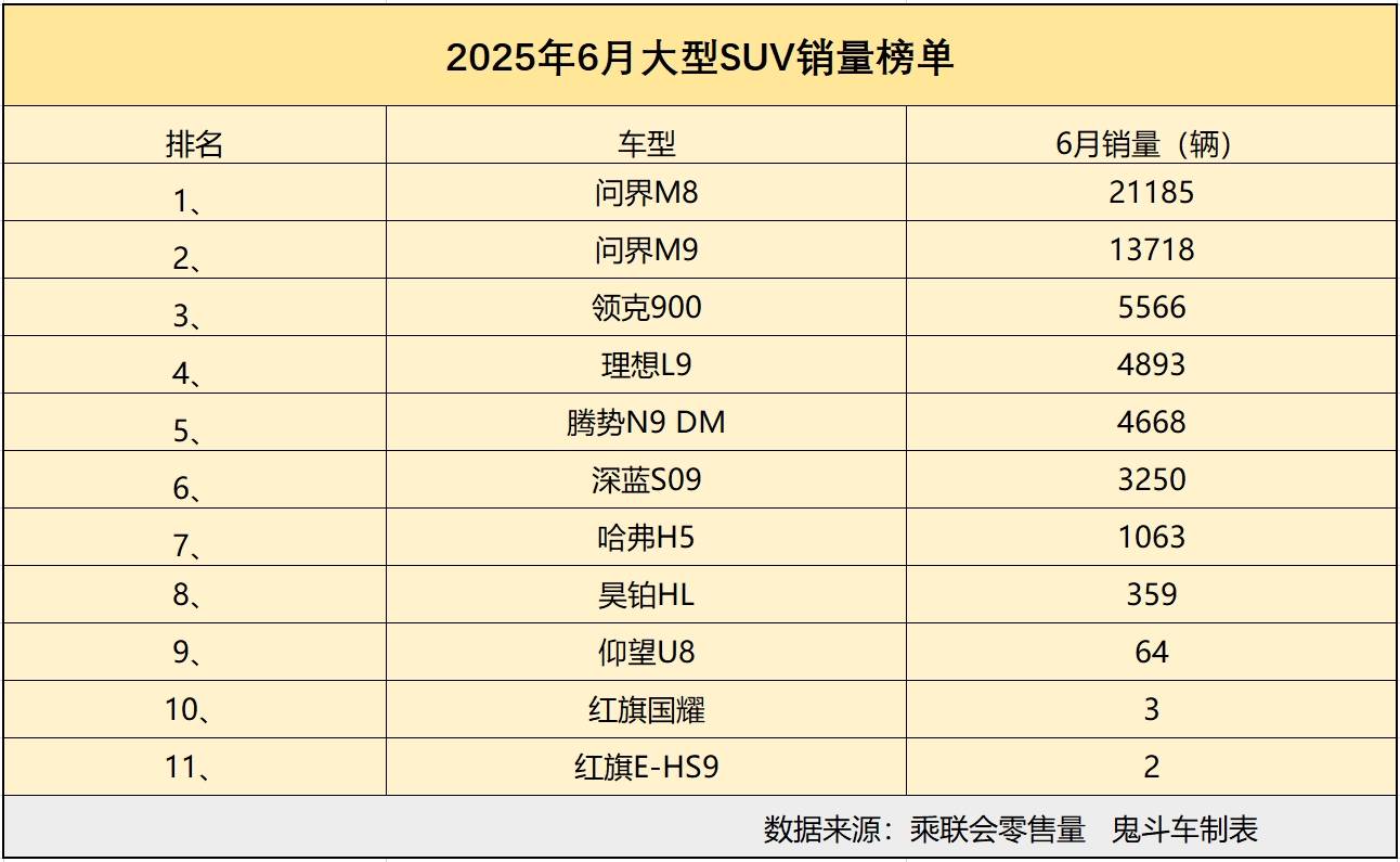 從當前銷量表現(xiàn)看,榜單上,僅有兩款車型銷量超過萬輛,其中,排名第一位的車型是問界M8,6月零售銷量達到21185輛,這款車型主打30萬-40萬級SUV市場,實際上,它跟理想L8同臺競技,智能、豪華方面料很足,銷量上可謂后來者居上,上市時間不長,直接拿下“銷冠”名號。
