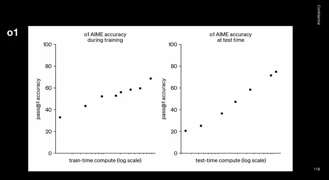 o1 的技術博客中展示了一張圖表:準確度和測試時計算之間存在對數線性關系,o1 的性能隨著訓練時間和測試時的計算而平穩提高