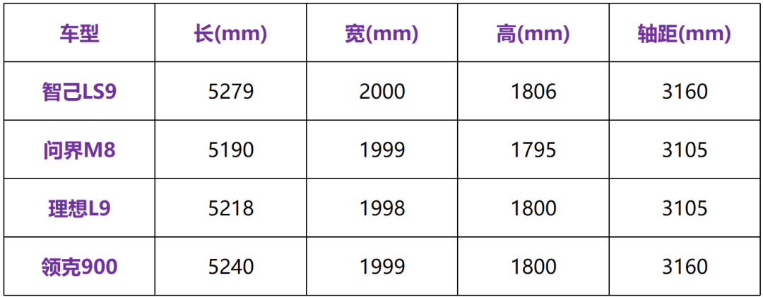 尺寸方面,智己LS9的軸距和長、寬、高,都完全壓制了問界M8、理想L9和領(lǐng)克900,是妥妥的D級大型SUV。