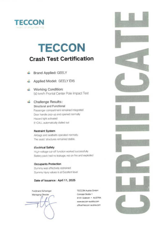 試驗結果顯示,撞擊發生后,銀河E5的四個車門均可順利開啟,E-CALL自動撥出救援電話,高壓系統即時斷電,電池無泄漏、無起火,氣囊、預緊安全帶全部正常工作,假人傷害值達到Euro NCAP剛性墻碰撞的優秀水平。這不僅意味著銀河E5具備真實事故場景下的高強度保護能力,也標志著吉利在智能電動時代對整車安全系統的深入理解與極致追求。