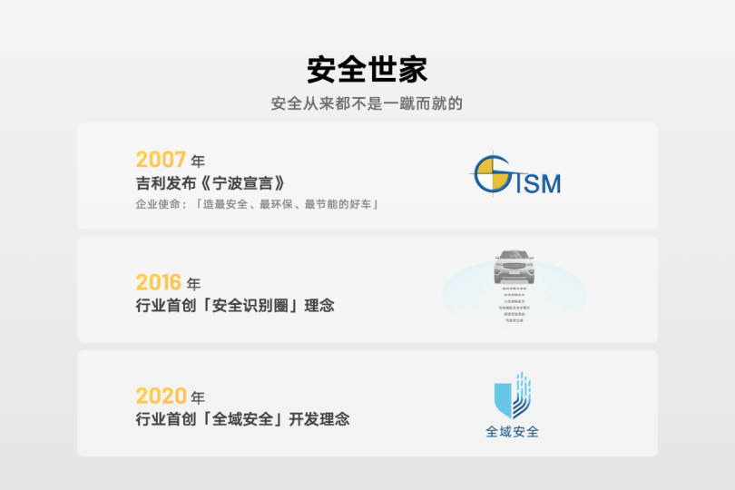 為什么吉利如此看重安全?本質上,這不是一種策略,而是一種根植于企業基因的造車觀。過去30年,無論是早期苦練基本功的積累期,還是如今全面擁抱智能電動時代的轉型期,吉利都從未在“安全”二字上打過折扣。無論是十多年前在《寧波宣言》中提出“造最安全的好車”,還是如今提出“安全平權”理念,吉利始終認為:讓消費者買得起,也用得安心,是品牌的責任,更是對用戶的尊重。這份堅守,沒有花哨的修飾,卻足夠厚重。