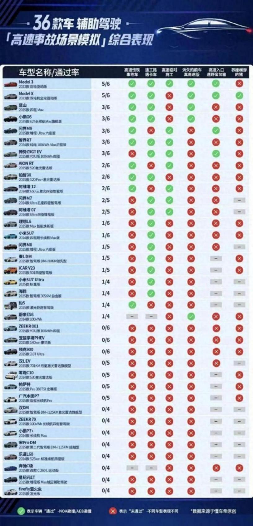 結(jié)果令人心驚:高速夜間遇施工卡車(chē)時(shí),僅47%車(chē)輛能安全避讓;兒童突然橫穿馬路場(chǎng)景,有效剎停率僅58%。更殘酷的是,沒(méi)有一款車(chē)型在所有測(cè)試中拿到滿分。