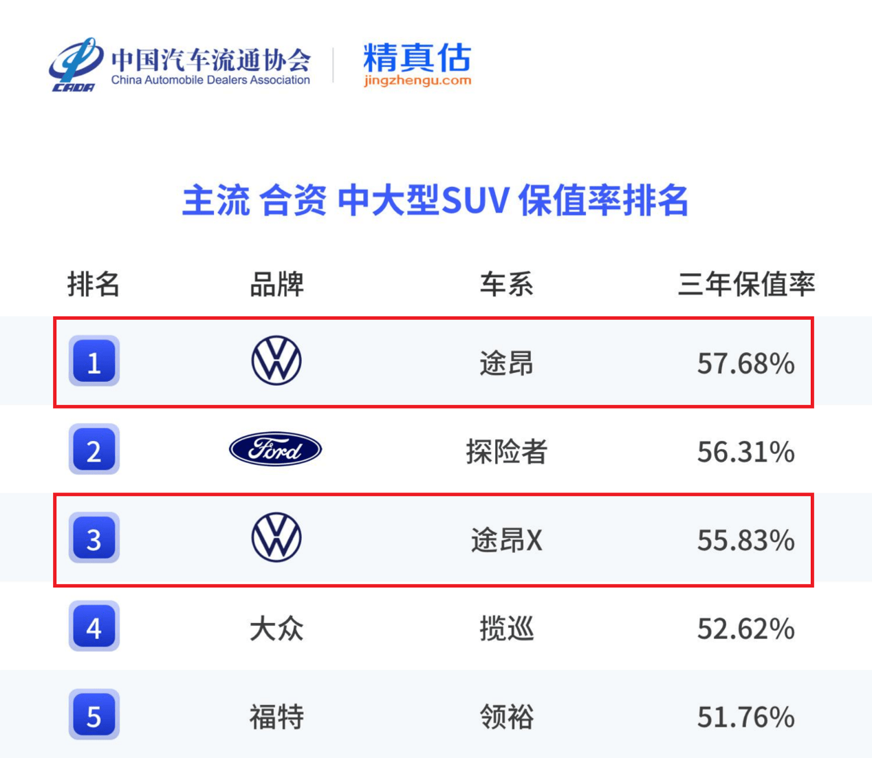 在燃油車領域,以71.35%的一年保值率,位居20-25萬合資中型SUV保值率榜首;途昂則以57.68%的三年保值率,在主流合資中大型SUV市場中拔得頭籌。