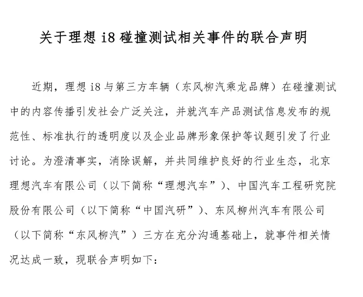 隨著理想、東風柳汽、中國汽研三方發布聯合聲明,理想i8碰撞事件也算告一段落了。不過,雖然這場鬧劇已經迎來了“大結局”,但理想的“輿論危機”卻沒停。