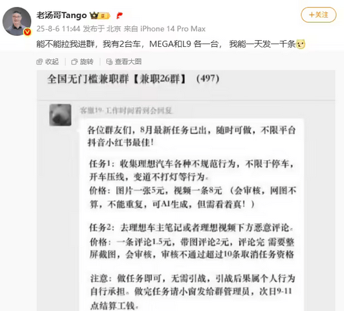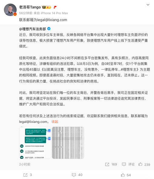 第一產(chǎn)品線負(fù)責(zé)人湯靖(微博名叫:老湯哥Tango)也是轉(zhuǎn)發(fā)理想法務(wù)部的帖子。