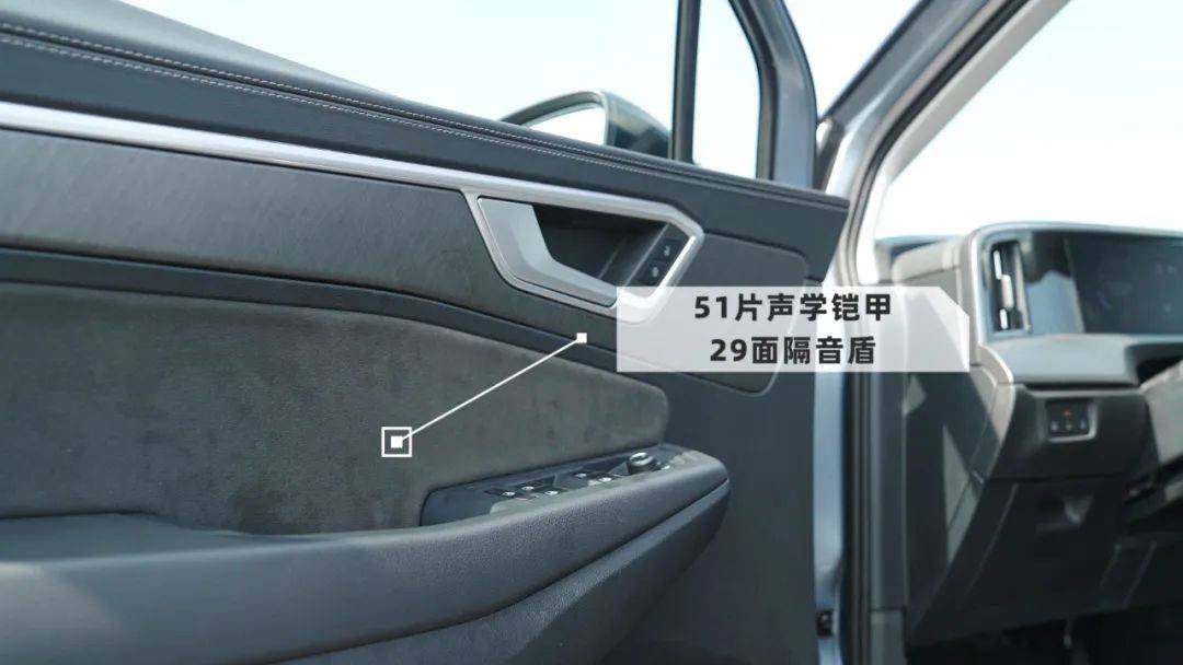 更關鍵的是,整車NVH表現也很出色,我們在上海長江大橋高速下實測車內僅59.5分貝,這背后,是51片聲學鎧甲+29面隔音盾的硬實力。