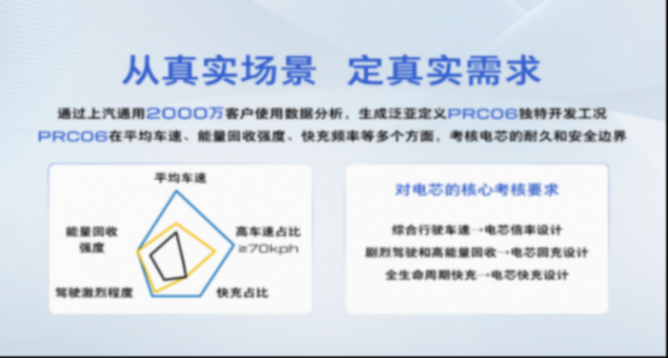 首先基于上汽通用2000萬客戶的“真實用車場景“數據,泛亞構建了映射真實需求的”行業最嚴苛測試標準“PRC06泛亞開發工況,該工況圍繞平均車速、高車速占比(≥70km/h工況占比)、快充使用占比、駕駛激烈度(加速/制動頻率)、能量回收強度這五大維度錨定電芯考核邊界,比行業標準的CLTC工況要嚴苛很多。