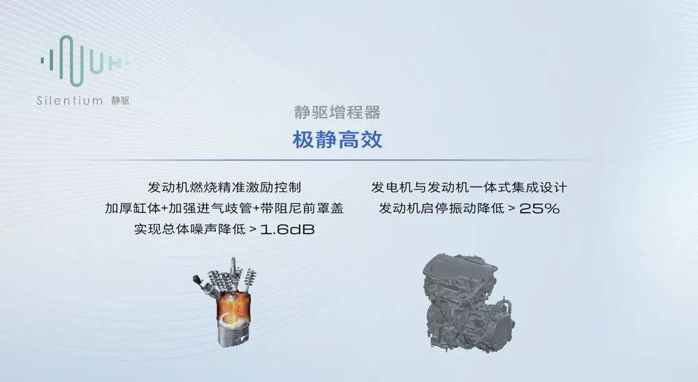 首先從源頭讓噪音輕下來,通過高效燃燒系統精準控制、搭載增程專屬加厚缸體、進氣歧管結構加強及帶阻尼減震的前罩蓋,成功地讓發動機整體噪音降低了1.6dB;并通過發電機與發動機同軸一體式設計,讓增程系統啟停時振動降低>25%,從而實現了無感化介入;