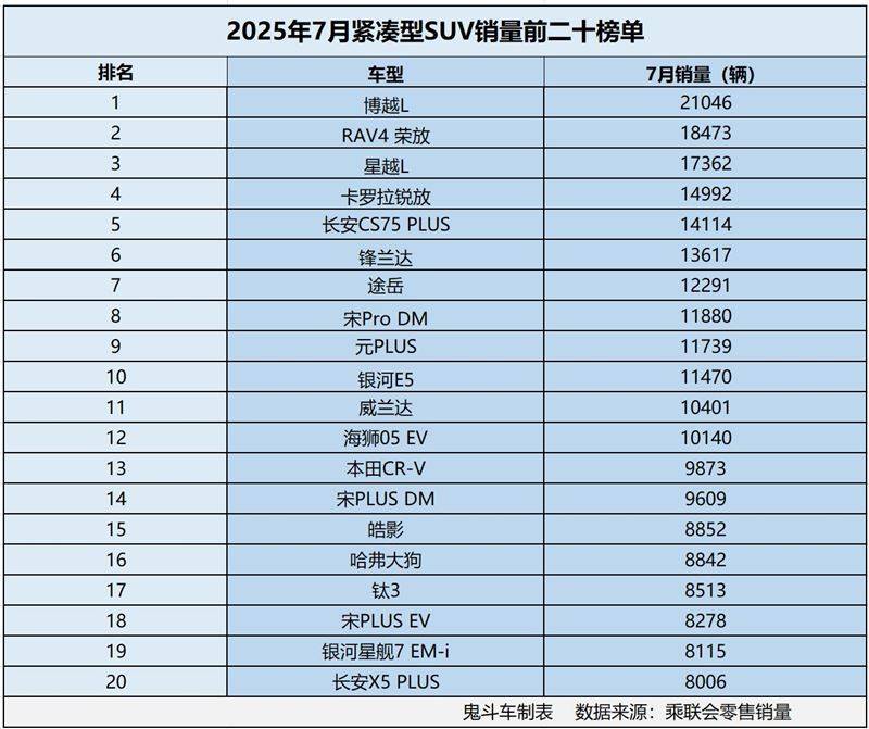 這一趨勢也體現在銷量上,日前,乘聯會發布7月零售銷量數據出爐,鬼哥整理出緊湊型SUV銷量排名前二十的榜單,接下來,看看哪些車型榜上有名?