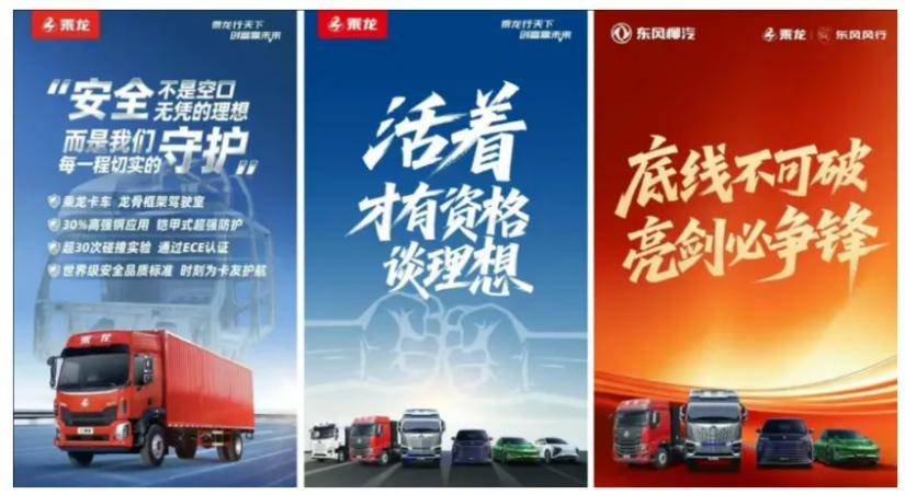 理想i8上市撞卡車(chē)凸顯安全,理想粉絲們看爽了;7月31日乘龍汽車(chē)開(kāi)始連續(xù)“反擊”理想,第一天發(fā)表聲明表示“理想未經(jīng)授權(quán)使用視頻,測(cè)試車(chē)未遮蓋車(chē)標(biāo),貶低品牌形象”,第二天發(fā)表《致乘龍卡友的一封信》表示測(cè)試場(chǎng)景和實(shí)際情況差異極大,不要偏聽(tīng)則信,第三天推送海報(bào)內(nèi)涵“活著,才有資格談理想”,第四天則喊出“龍的脊梁,無(wú)懼挑戰(zhàn)”硬氣宣言。