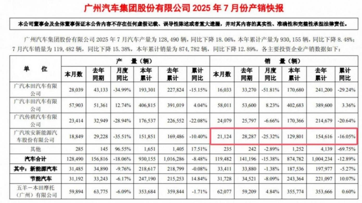 盡管新能源市場銷量火爆,但來自廣汽集團的產銷快報卻顯示,廣汽埃安正遭遇新能源市場 “寒流”,銷量下滑勢頭持續擴大。最新數據顯示,其7 月銷量 21124 輛,同比下滑 25.32%;前 7 月累計 129801 輛,同比下滑 16.05%。