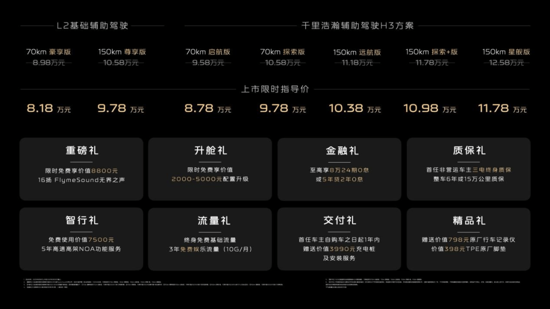 上市限時指導價為8.18萬元-11.78萬元,且下訂用戶限時免費享價值8800元的16揚Flyme Sound無界之聲、限時免費享價值2000-5000元配置升級、限時享8萬24期0息等八重購車權益以及不限品牌的8000元超級置換金。