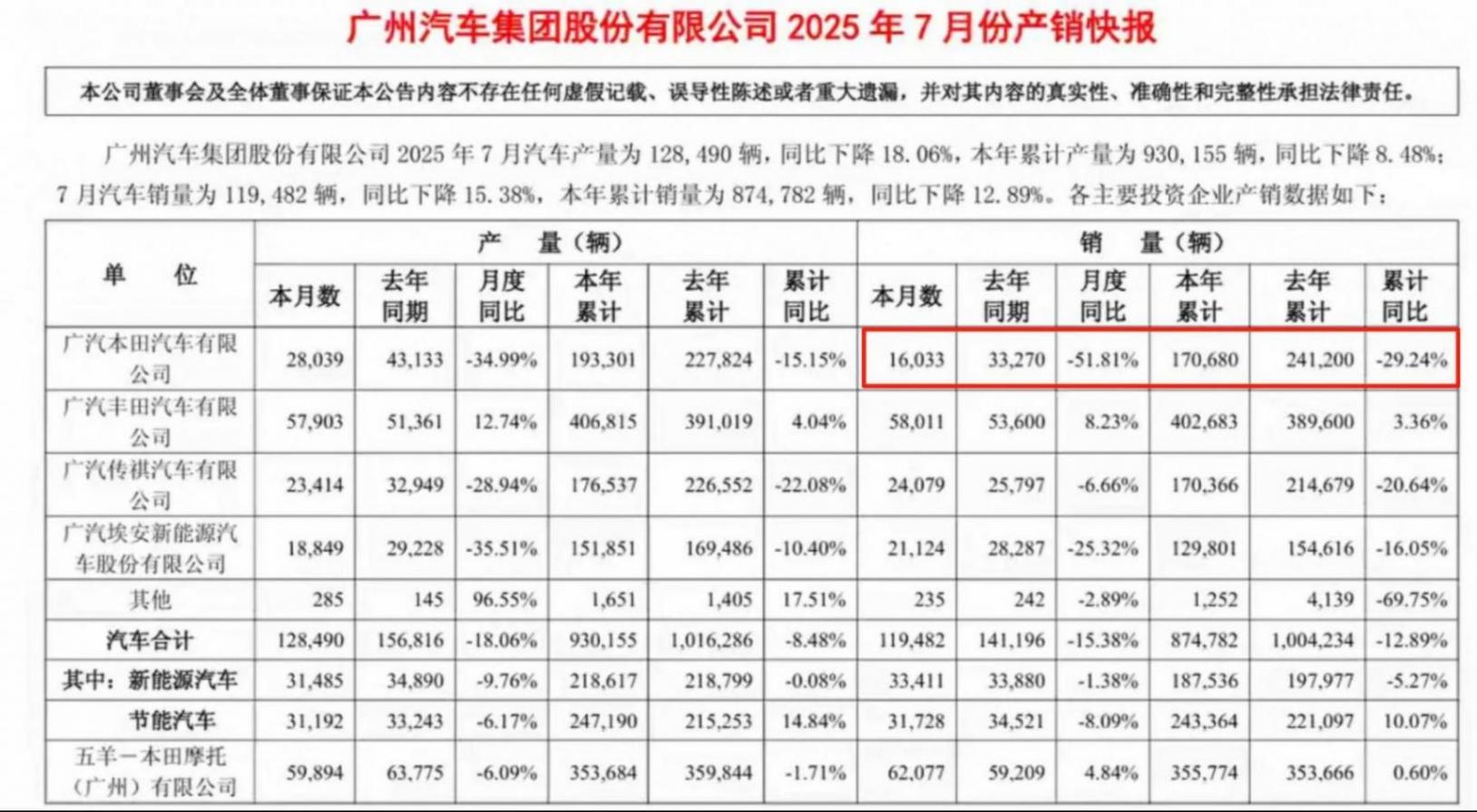 來自廣汽集團披露的7月銷量數(shù)據(jù)顯示,7月份廣汽本田以月銷16033輛,同比暴跌51.8%的成績領跌廣汽集團各大品牌。而今年1-7月廣汽本田累計銷量為17萬余輛,同比再跌29.24%,令人咋舌。