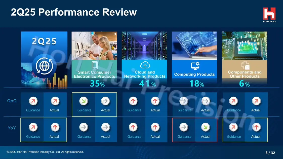 數(shù)據(jù)顯示,今年第二季度,富士康 AI 服務(wù)器營收首次超過 iPhone 等消費(fèi)電子產(chǎn)品所創(chuàng)造的營收。“云和網(wǎng)絡(luò)產(chǎn)品”部門當(dāng)季營收占比達(dá)到 41%,較 2024 年增長了 9 個百分點(diǎn)。除此之外,“智能消費(fèi)電子產(chǎn)品”占比 35%,“計算產(chǎn)品”占比 18%,“元器件及其他產(chǎn)品”占比 6%。