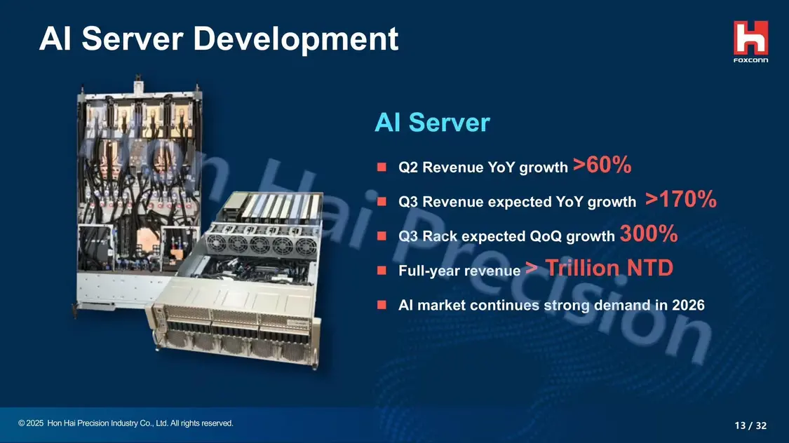 其輪值 CEO 楊秋瑾在昨日的 2025 年第二季度法說會上表示,鴻海 AI 服務(wù)器業(yè)務(wù)持續(xù)強(qiáng)勁。該部分業(yè)務(wù) Q2 營收同比增長 60+%,預(yù)計三季度營收同比增幅有望進(jìn)一步擴(kuò)大至 170+%,而全年 AI 服務(wù)器可貢獻(xiàn)超 1 萬億新臺幣(IT之家注:現(xiàn)匯率約合 2390.43 億元人民幣)營收。