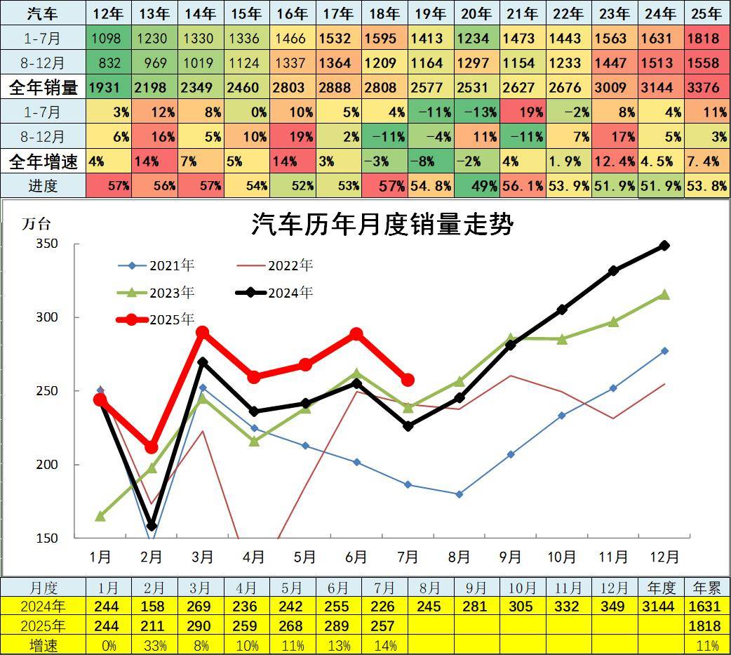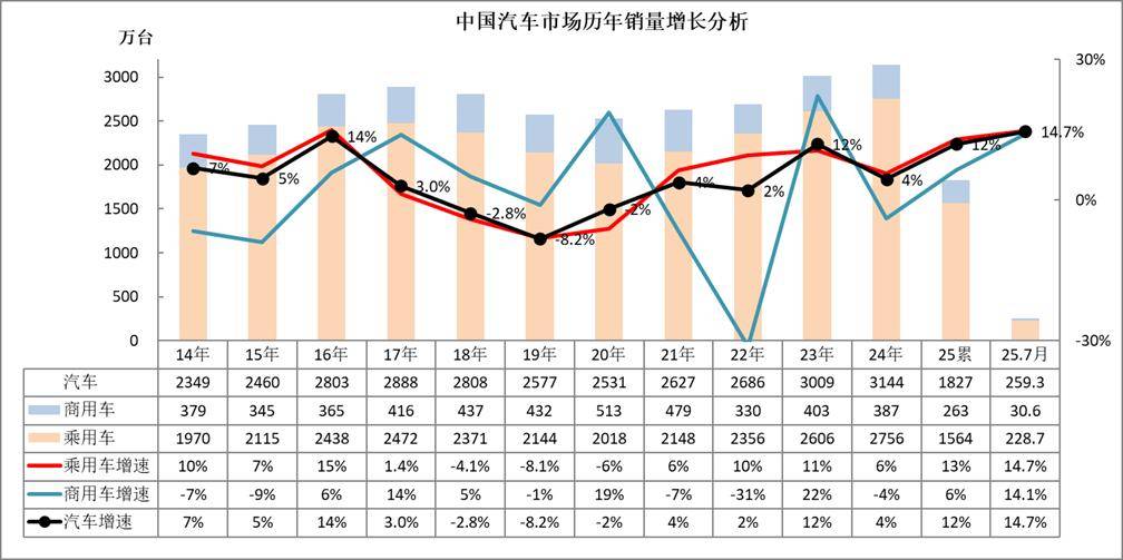 2025年1-7月累計汽車總計銷量1818萬臺,累計增速11 %;7月汽車總計銷量257萬臺,同比增長14.1%。今年7月乘用車銷量走勢環比回落較大,政策補貼驅動上半年增長,7月合理回落。