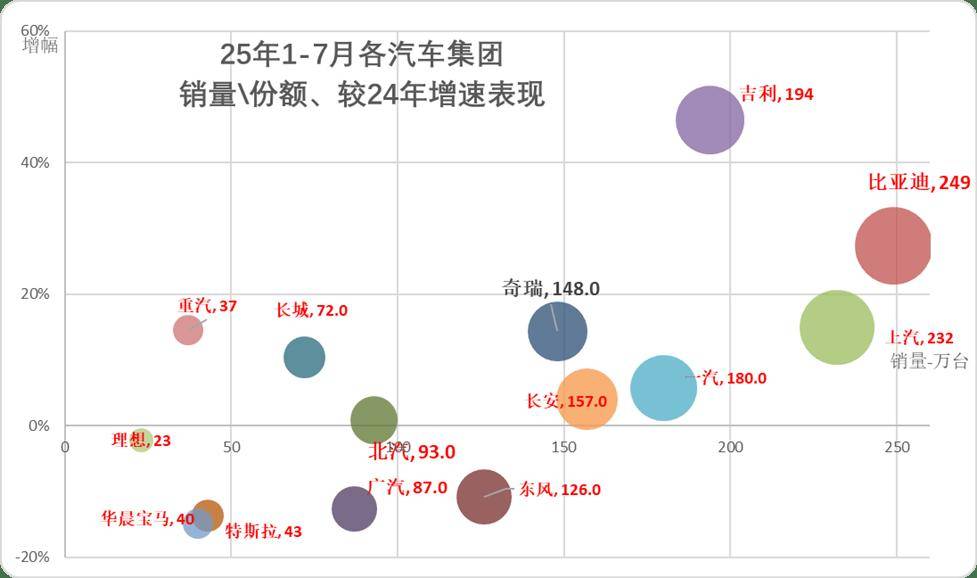 汽車市場的廠家格局巨變,行業呈現增速劇烈的分化,2025年開始的民營企業替代國企成為行業主力,吉利、比亞迪、奇瑞、長城增速保持較高水平,這種現象目前有可持續的趨勢。