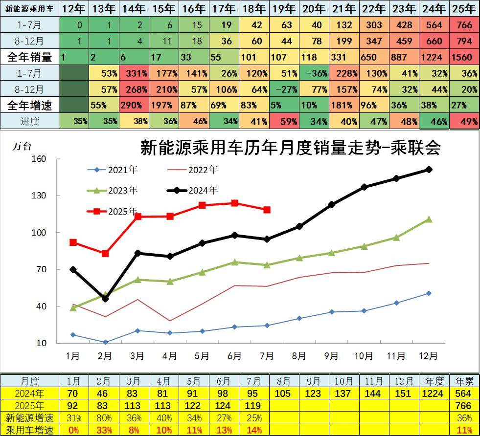 2025年7月新能源乘用車合計銷量119萬臺,同比增25%;1-7月新能源乘用車合計批發銷量766萬臺,同比增36%。