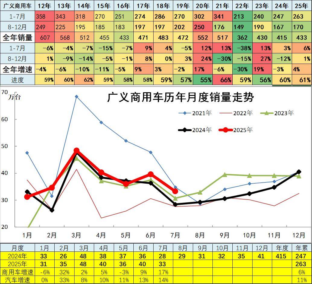 2025年1-7月累計廣義商用車銷量263萬臺,累計增速6%;7月廣義商用車銷量33萬臺,同比增長17%。