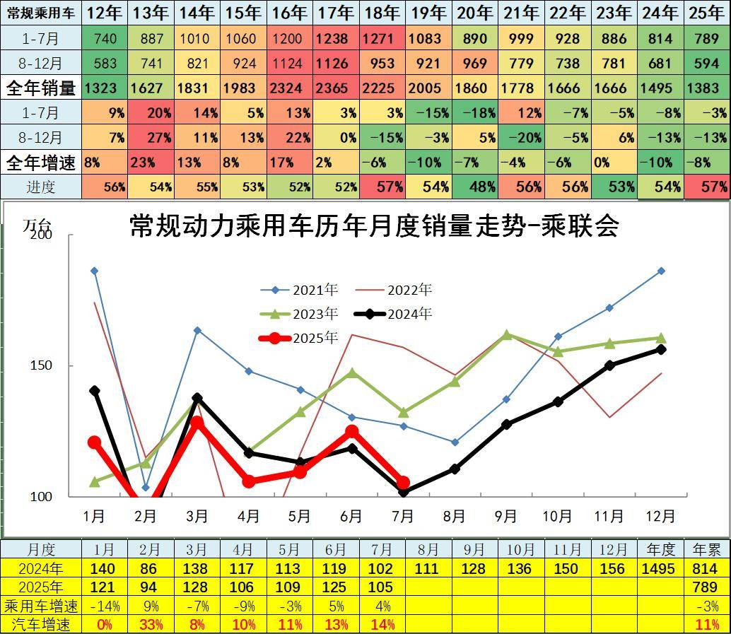2023年傳統燃油狹義乘用車銷量1666萬臺,較2022年同期基本持平;2024年傳統狹義乘用車銷量1495萬臺,較去年同比下降10%;2025年1-7月銷量789萬臺,同比下降3%,其中7月增4%。