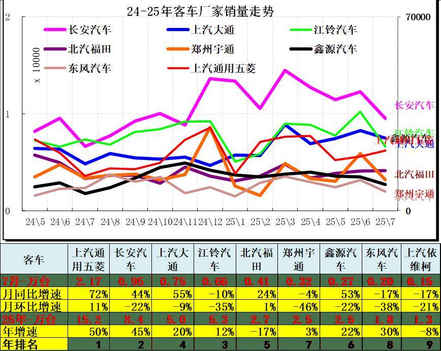 2025年初客車走勢相對很強。2025年6月頭部廠家銷量沖刺,7月環比下降不大,尤其是7月的上汽通用五菱環比增長11%。2025年五菱和鑫源的商用車走勢較好。由于新能源的微客類恢復增長,7月的鑫源和山西成功的微客類客車車型較強。