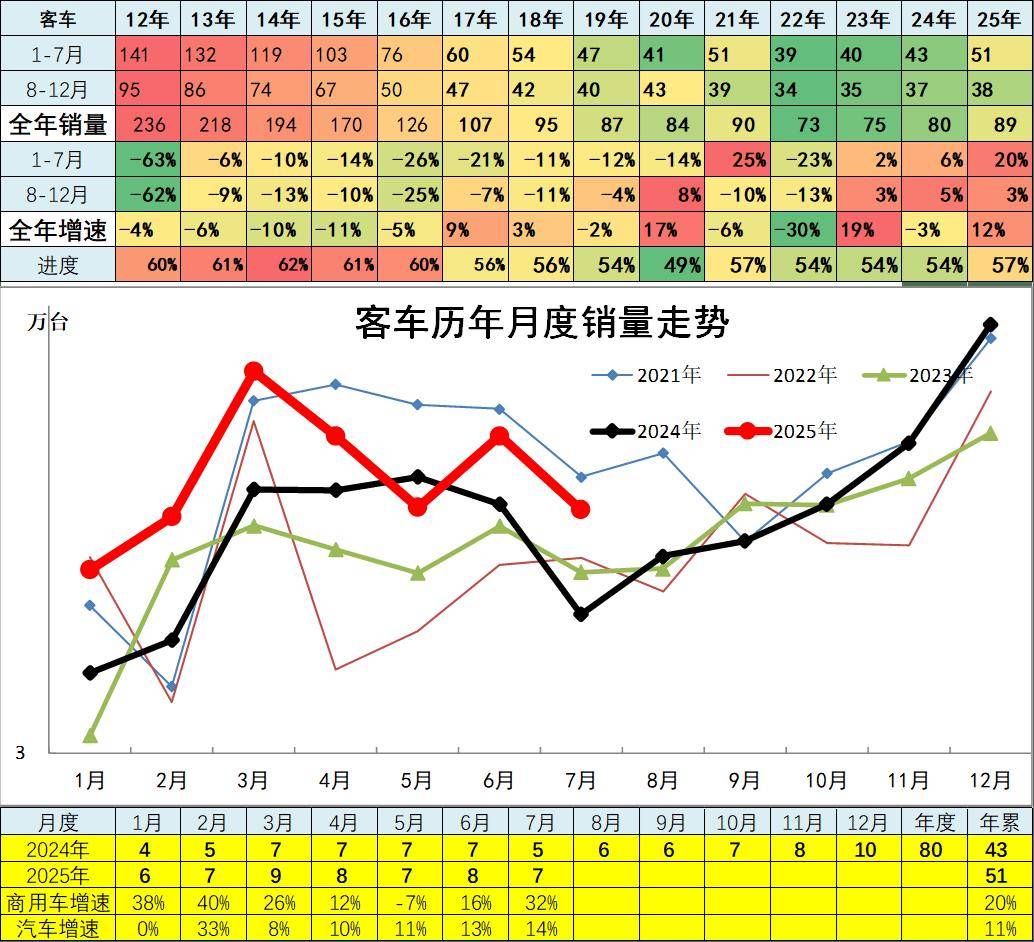 2023年全年累計廠家銷量客車合計銷量75萬臺,累計增速19%;2024年累計客車合計銷量80萬臺,累計下降3%;2025年1-7月累計客車合計銷量43萬臺,累計增速20%;7月客車合計銷量7萬臺,同比增長32%。