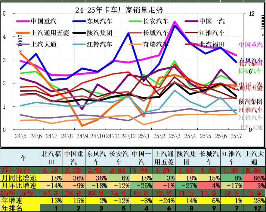 2025年的卡車主力廠家分化較明顯,福田汽車和重汽汽車等同比去年7月暴增,江淮與長安的7月同比表現不強。
