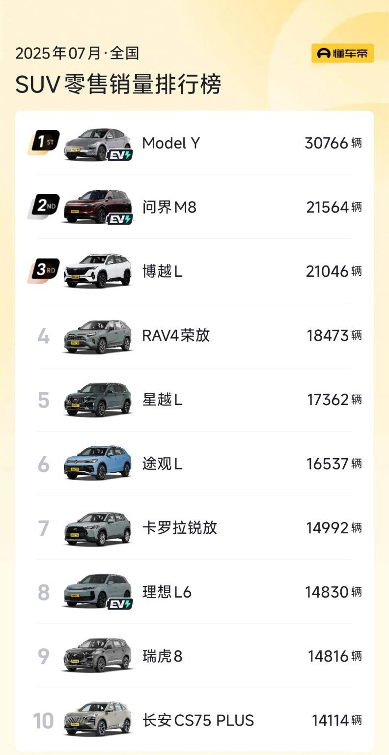 SUV榜單呈現的市場趨勢稍有不同,盡管特斯拉Model Y和問界M8分別以月銷30766輛和21564輛的成績分列前兩名,但燃油車在TOP10中占據了七席,說明在SUV市場傳統燃油車依然受到認可。