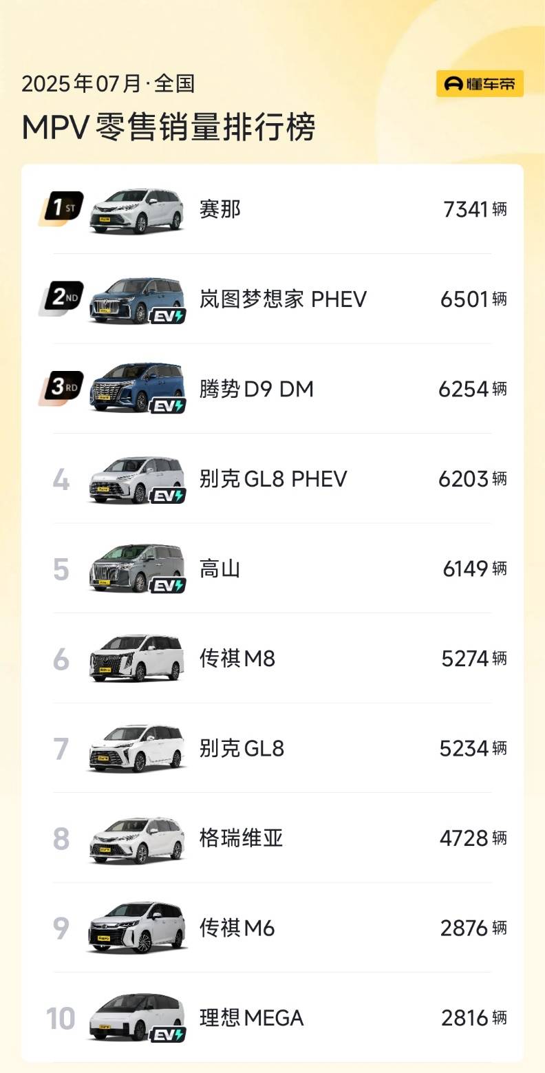 MPV市場排在榜首的終于是燃油車了,賽那以月銷7341輛的成績力壓群雄,不過在TOP10的榜單中新能源車依然占據了六席。