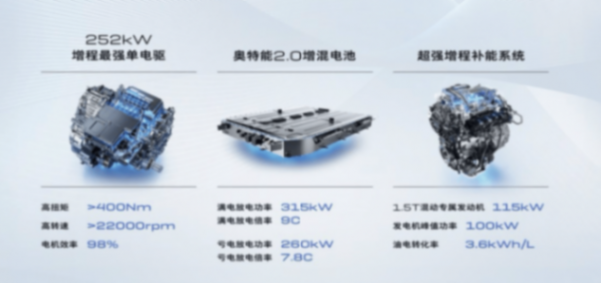 上汽通用自主研發的1.5T混動專用發動機,在轉化效率和峰值功率上有天然優勢,可輸出115kW最大功率和高達 3.6kWh/L油電轉化率,配合同級最大功率的100kW增程電機,動力輸出堪比3.0T V6燃油發動機。