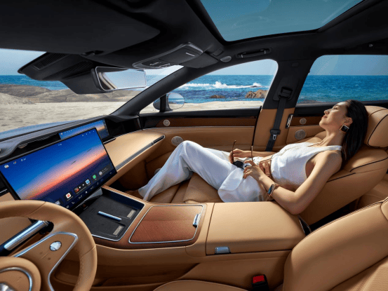 我們?cè)賮?lái)看看座艙內(nèi),首先在內(nèi)飾顏色上,提供赤茶橘、白沙杏、松露棕、琥珀棕四色可選,并且內(nèi)飾樣式也有變化,儀表臺(tái)上方為一個(gè)貫通的區(qū)域,副駕新增了12.3寸副駕屏以及125°零重力座椅,解決了此前享界S9副駕乘坐體驗(yàn)的痛點(diǎn),很顯然這次的重心從后排挪到了前排,更符合大多數(shù)人的用車(chē)需求。