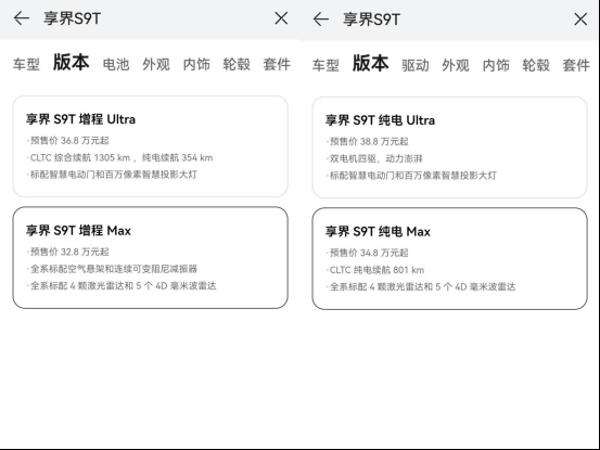 配置劃分上,享界S9T純電版和增程版都分為Max和Ultra兩個(gè)配置層級(jí),增程Ultra相較于Max換裝了53度大電池,純電續(xù)航里程提升至354km,并可選黑曜套件,而純電Ultra相較于Max則是動(dòng)力升級(jí)為雙電機(jī)四驅(qū)。